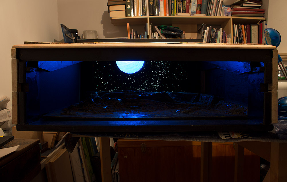 I thought to myself what it would be to be able to leave Earth and photograph other worlds to be the first human photographer to visit Mars or Mercury or the moons of Jupiter. It struck me, that the information was almost certainly available (though space probes, satellites and telescopes) to make virtual copies of these landscapes, however, rather than making a computer-generated model I thought that it would be interesting to make my own version of a ‘peep show’ in which the landscape is contained inside a box and then to photograph that. I liked this idea because of how it plays with the notion of ‘virtual reality’ and ‘digital and analogue’ realities: e.g. I am taking digital information from space probes and then converting it into analogue information (the landscape) before re-digitising it in the digital camera. In a sense this is commenting on the often-strained relationship that analogue and digital photography have.