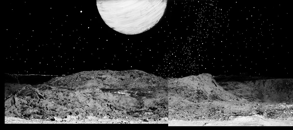 For next step I used a piece of software that already happened to own which enables me to virtually (on my computer) to travel to any reasonably sized body in our solar system, to enter a time and date (the date that I started the project) and to have to sky shown before me with all of the astronomical bodies in their correct positions. I chose for my first scene / destination the planet Uranus’s moon Umbriel and the large crater located at its north pole named Wunda (after a character from Australian Aboriginal myth). This was chosen because I had looked at this crater before and made an illustration of it as part of BA at UWE Bristol; my interests in science and astronomy in art go back more than 15 years. Wunda is an interesting crater because it is large (131 km in diameter), oddly shaped and unlike the rest of the moon appears to be bright white.